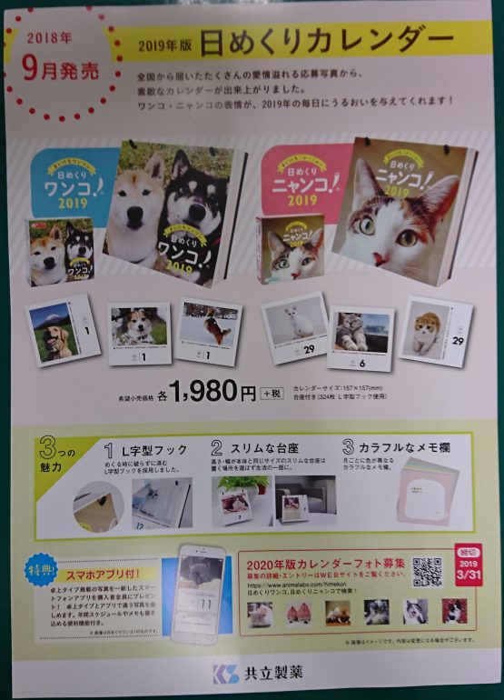 当院、受付にも飾ってあります、わんちゃん、ねこちゃんの日めくりカレンダーの2019年版が発売になります。